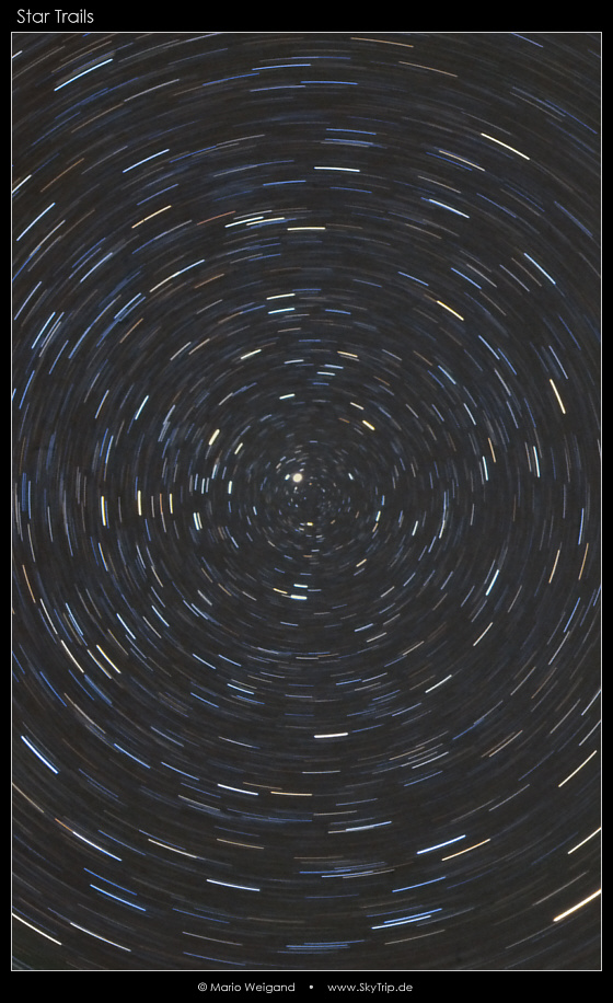 : Eine Streifenaufnahme des nördlichen Himmelspols. Es ist gut zu erkennen, dass der Polarstern nicht exakt am Himmelspol sitzt.