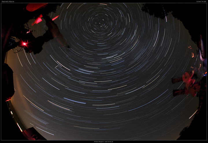 Kommentar: Fisheye-Aufnahme des Himmels über Riedelbach. Mit dem 8 mm Sigma-Fisheye und der Canon EOS 450D habe ich 70 Minuten Erddrehung und zufälliger Weise einen Meteor aufgenommen.