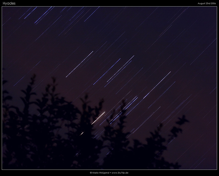 : Die Hyaden gehen hinter einem Busch auf. Eine durchziehende dünne Wolke, die von Straßenlaternen beleuchtet wird ist für den rötlichen Schleier verantwortlich. Der hellste Stern ist natürlich Aldebaran.