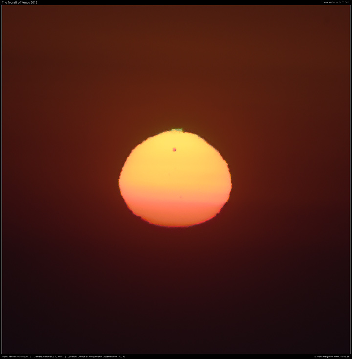 : Gegen 5 Uhr MESZ war bereits die gesamte Sonnenscheibe zu sehen. Nach wie vor mit schlechtem Seeing – aber gelegentlichen grünen Segmentierungen am oberen Rand... Ganz schwach lassen sich auch Sonnenflecken erkennen.