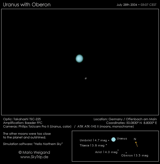 : Leider war der scheinbare Abstand fast aller Monde in dieser Nacht so gering, dass sie bei der 30 Sekunden belichteten Aufnahme von Uranus überstrahlt wurden. Lediglich Oberon war weit genug von Uranus entfernt.