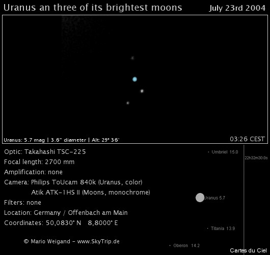Kommentar: Zum ersten mal ist es mir hier gelungen, die Uranusmonde zu fotografieren. Leider ist die Webcam nicht lichtempfindlich genug,