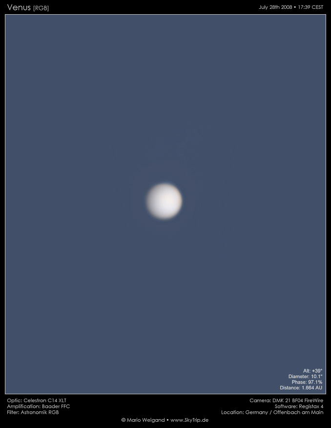 Das erste Bild der östlichen Elongation ist ein RGB-Komposit, das mit der DMK 21 BF04 und RGB-Filtern von Astronomik entstanden ist. Es zeigt das ca. 10" kleine weiße Scheibchen mit dem, dank Rayleigh-Streuung, blauen Streulicht-Vordergrund des Taghimmels. Die Phasengestalt ist erkennbar.