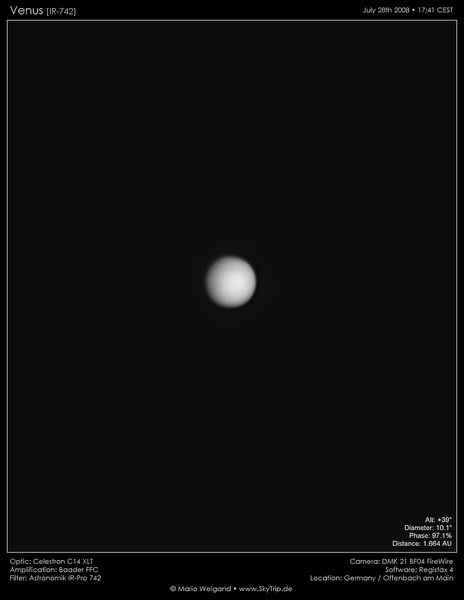 Erwartungsgemäß ist das IR-Bild dem RGB in Sachen Schärfe überlegen. Das Bild zeigt viel deutlicher, dass die Phase mit 97,3% Beleuchtungsanteil nicht ganz voll ist. Strukturen sind mit diesem Filter eine Seltenheit. Leider hat die Zeit für eine UV-Aufnahme nicht mehr gereicht.