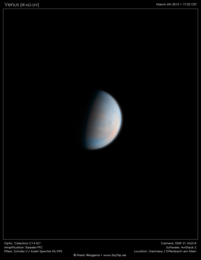 Kommentar: Am 6. März 2012 gelangen das erste Bild dieser Elongation. Aus einer UV- und einer IR-Aufnahme entstand dieses Farbkontrastbild. Dabei bildet ein Mittel aus IR und UV einen synthetischen Grünkanal.