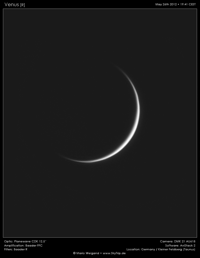 Daher ist es ratsam am Taghimmel auf die Suche zu gehen. So gelang mir am 26. Mai gegen 19:40 MESZ diese Aufnahme der dünnen Venussichel –