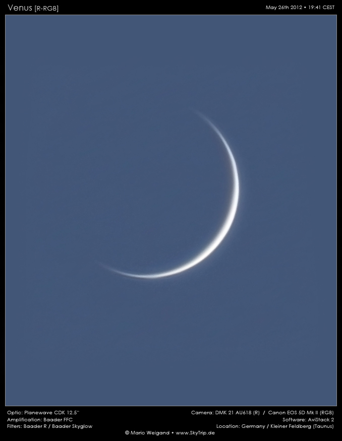 Daher ist es ratsam am Taghimmel auf die Suche zu gehen. So gelang mir am 26. Mai gegen 19:40 MESZ diese Aufnahme der dünnen Venussichel –