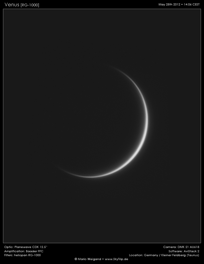 : Tag für Tag schrumpft der sichtbare Anteil der beleuchteten Seite. Am 28. Mai waren es inzwischen nur noch 2,7% – eine hauchdünne Sichel! Festgehalten mit einer DMK 21 AU618-Kamera am 12,5"-Astrographen.