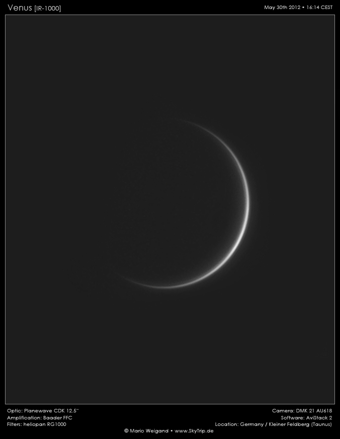 Kommentar: Diese neue Aufnahme vom 30. Mai 2012 zeigt wieder die Venussichel, dieses Mal liegt der sichtbare Anteil der beleuchteten Seite bei nur noch 1,5%.