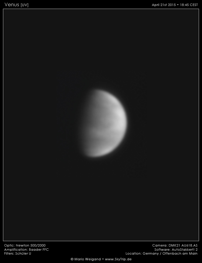 Kommentar: Während der Schönwetterperiode im April gab es am 21. April wieder ausreichend ruhig Momente am Taghimmel. Das Seeing war für UV-Aufnahmen zwar wieder schwierig, jedoch war es dieses Mal etwas einfacher, Wolkenstrukturen sichtbar zu machen.