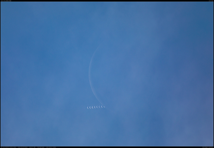 Ein Verlaufskomposit der Venusbedeckung 2020. Die Aufnahmen dafür entstanden am Pentax 105 SDP Astrograph mit Canon EOS 5D Mark IV und AstroPhysics 2x Barlow.