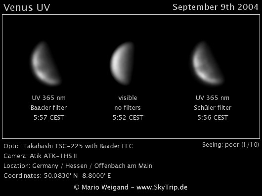: Mein erster Versuch, die Venus im UV zu fotogarfieren. Grobe Einzelheiten und Wolkenformationen sind erkennbar. Es ist äußerst schwierig im UV zu arbeiten, da der Filter enorm viel Licht schluckt.