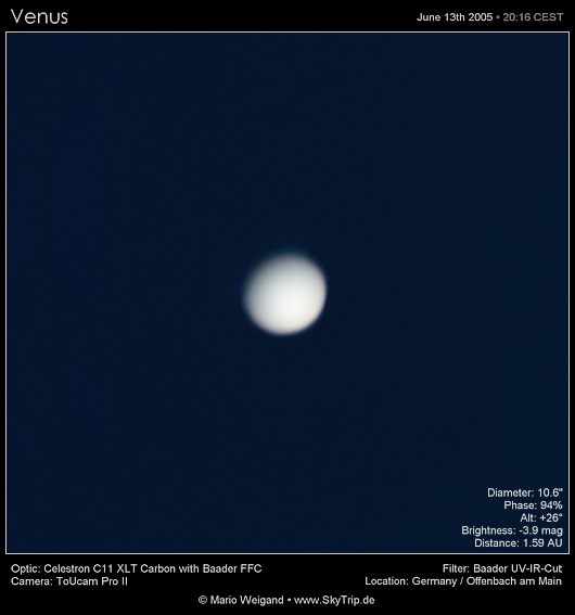: Das Bild gibt (bis auf die Korrektur der atmosphärischen Refraktion) sehr gut den visuellen Anblick im C11 wieder, wobei die Venus visuell etwas gleißender erscheint.