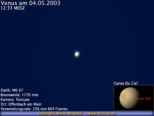 : Meine erste Beobachtung der Venus am Taghimmel. Auch wenn man keine Details erkennt hat es durchaus seinen Reiz, vor allem visuell! Wenn man erst einmal weiß, wo sie sich befindet, ist sie im Sucher kaum zu übersehen.