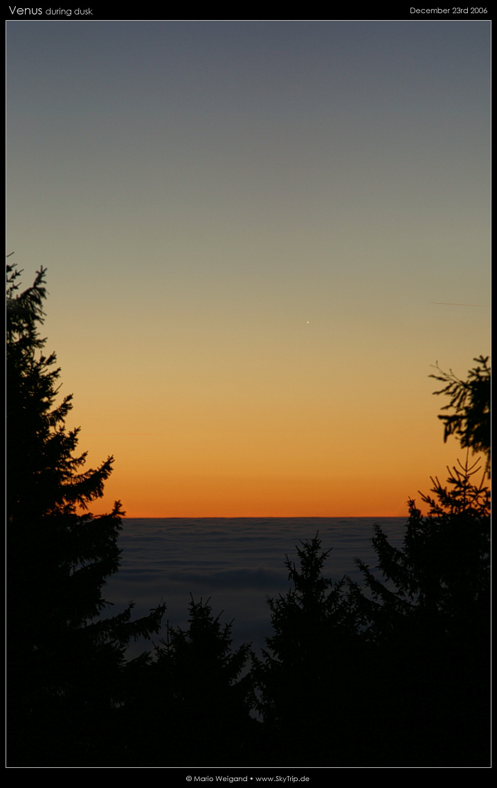 Kommentar: Venus hat nun ihre obere Konjunktion hinter sich gebracht und ich konnte sie nach einer langen Schlechtwetterperiode endlich am Abendhimmel sichten. Die Aufnahme entstand auf dem großen Feldberg im Taunus und zeigt auch das Nebelmeer in den Tälern.