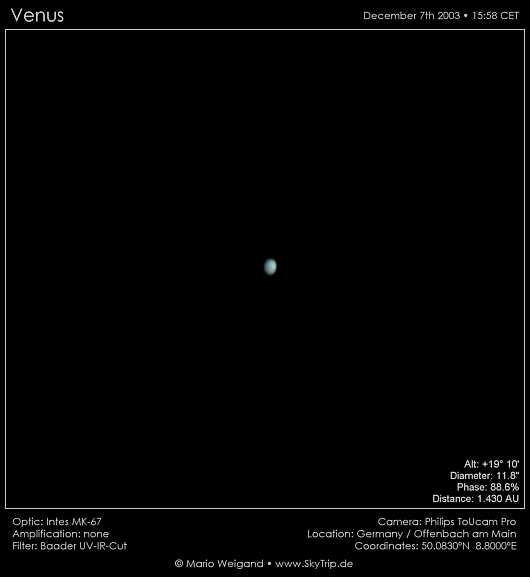Kommentar: Wieder Venus am Taghimmel . Inzwischen ist die obere Konjunktion vorüber und sie zeigt sich am Abendhimmel knapp über dem Horizont. Jedoch noch zu knapp, weswegen immernoch Tagbeobachtung angesagt ist. Langsam wird sie zu einer kleinen Halbvenus, jedoch wird es noch fast vier Monate dauern bis sie zur Halbvenus geworden ist. Ihr momentaner scheinbarer Durchmesser beträgt 11,8", nicht sehr viel. Zudem ist bei ~14° Höhe kein besonders gutes Seeing zu erwarten, daher war es sinnlos höher zu vergrößern...