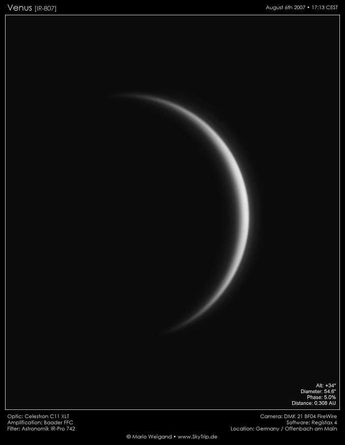 Kommentar: 12 Tage vor der unteren Konjunktion sind nur noch 5% der Venus übrig, der scheinbare Durchmesser ist inzwischen auf 54 Bogensekunden angewachsen. Die Winkeldistanz zu Sonne betrug etwa 18°, bis zur Konjunktion wird er auf etwa 8° schrumpfen.