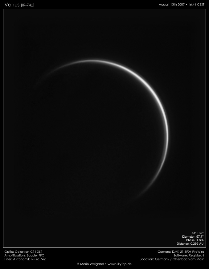 Kommentar: Nur noch 5 Tage bis zur unteren Konjunktion und gerade mal 10° und 16' Abstand zur Sonne. Bei so geringem Sonnenabstand muss man natürlich vorsichtig sein. Damit nicht zu viel Sonnenlicht direkt in den Tubus fällt, habe ich die Taukappe verlängert.