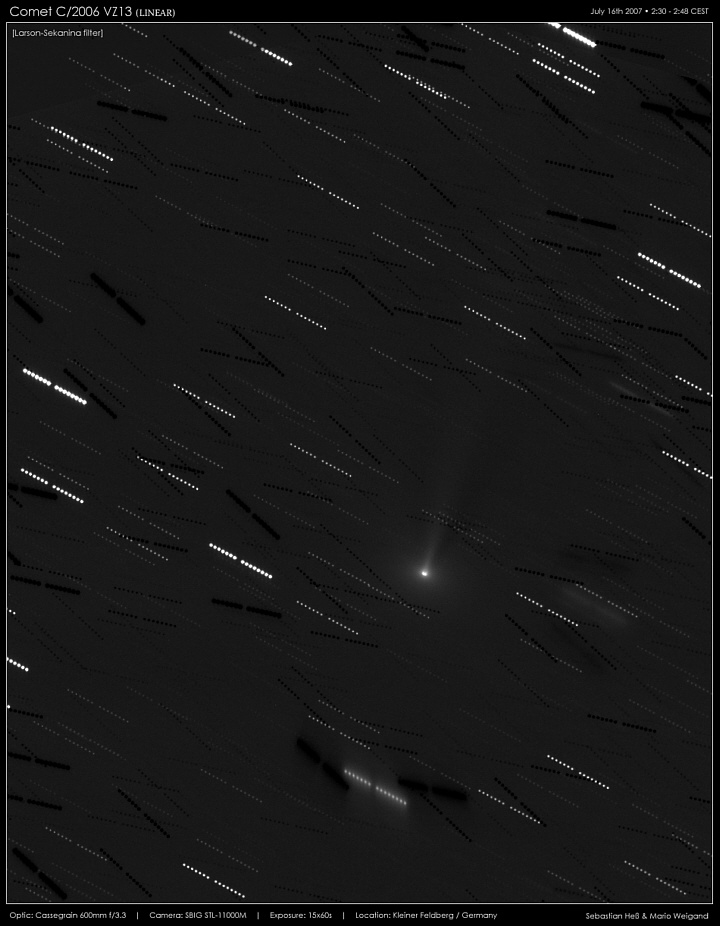 Kommentar: Auf die Aufnahme von VZ13 habe ich mit dem Freeware-Programm Fitswork den Larson-Sekanina-Filter angewendet. Er eignet sich um radiale Kontraste zu verdeutlichen.
