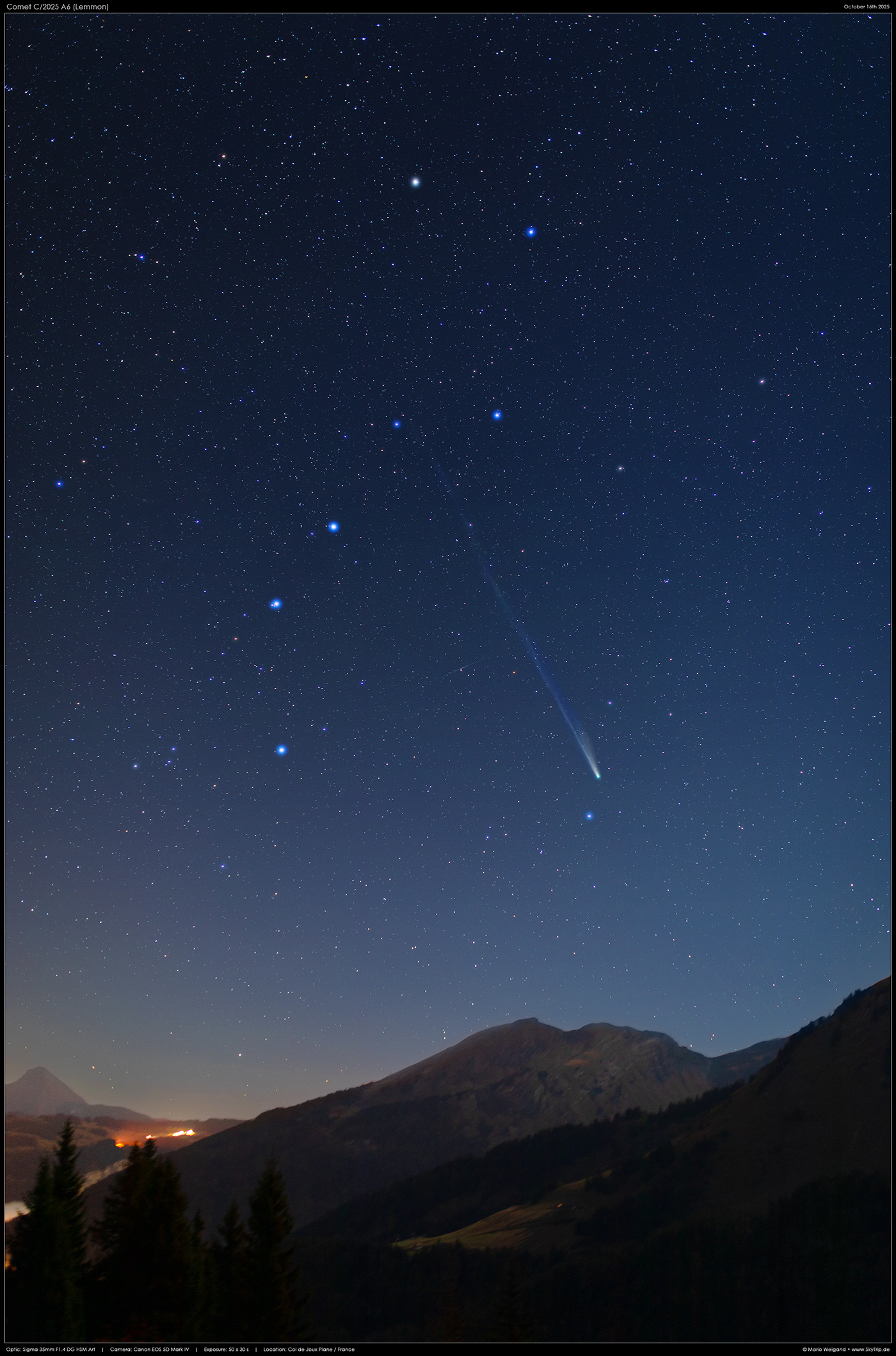 Kommentar: Komet C/2025 A6 (Lemmon) beim Großen Wagen über den französischen Alpen am 16. Oktober 2025 zwischen ca. 5:30 und 6:00 Uhr. Der Schweif erstreckt sich inzwischen über mehrere Grad!
