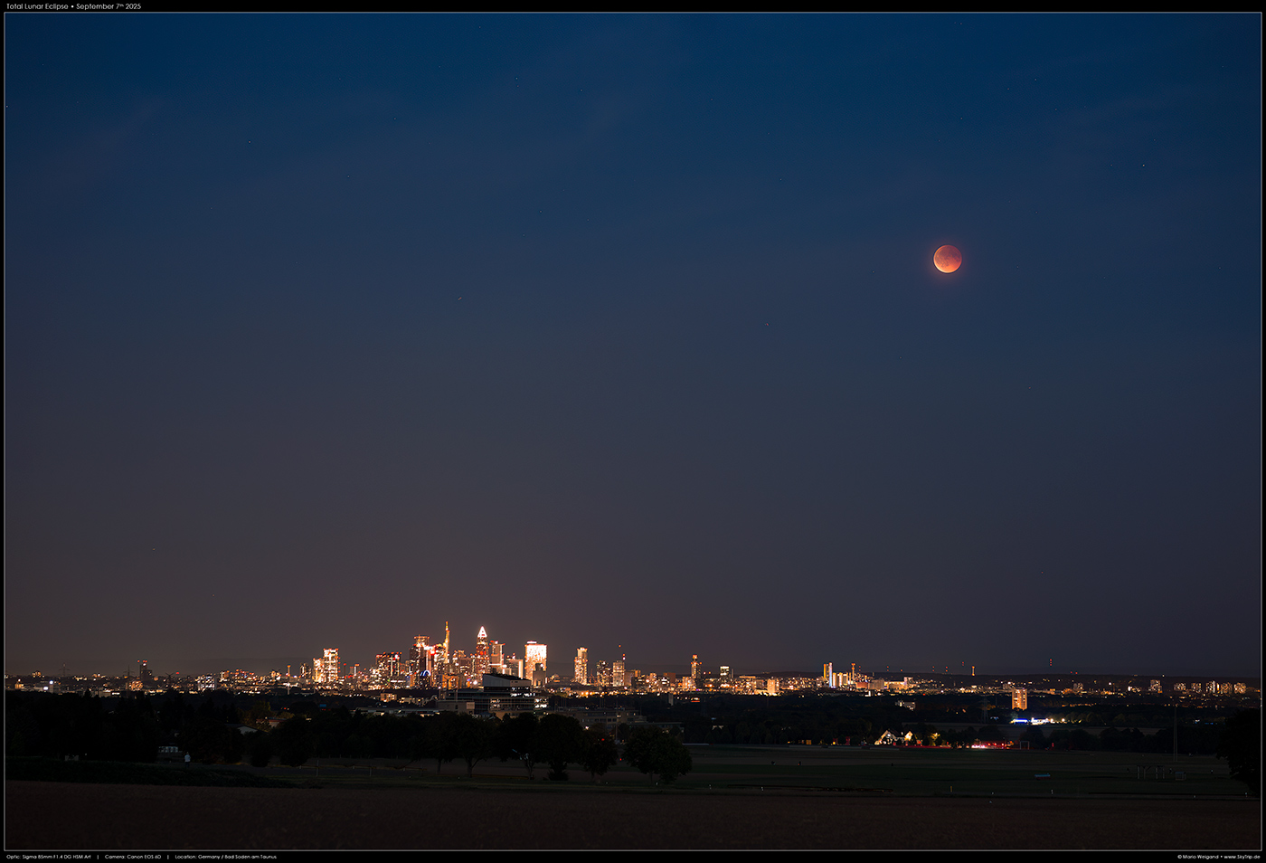 : Bei Mondaufgang war die Totalität schon voll im Gange, jedoch blieb der Mond noch eine Weile unsichtbar. Es dauerte einige Zeit, bis sich der dunkelrote Mond gegen den noch recht hellen Dämmerungshimmel durchsetzen konnte.
