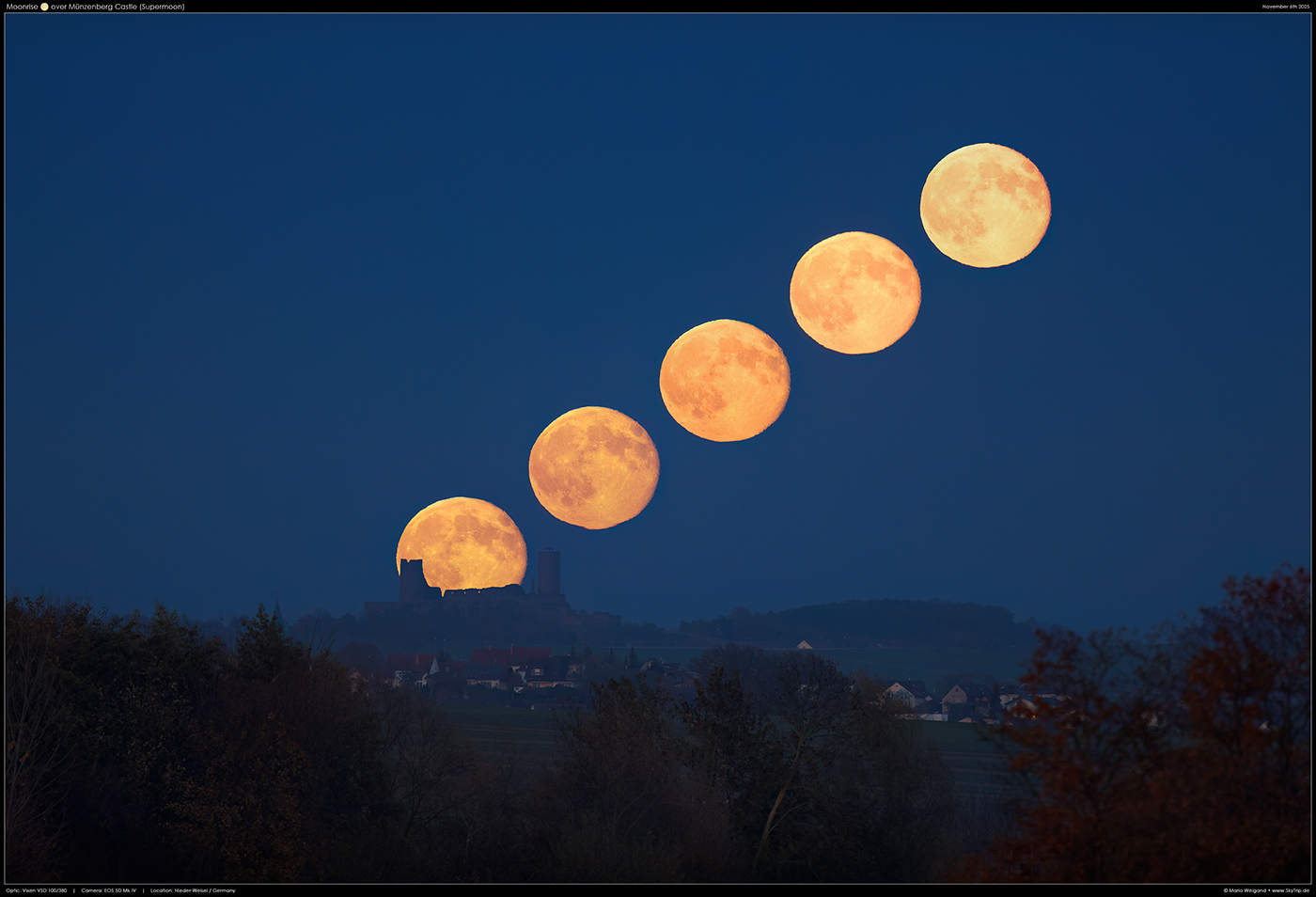 Aufgang des Super-Vollmondes über den Zwillingstürmen der Burg Münzenberg in der Wetterau.