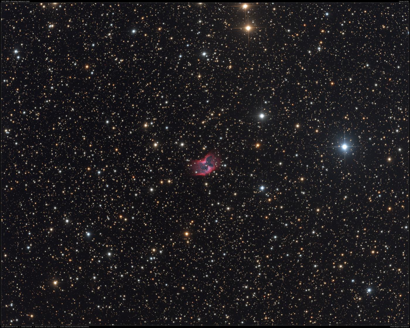 : NGC 2899 ist ein planetarischer Nebel im südlichen Sternbild Vela, der sich in einer Entfernung von 3.350 Lichtjahren befindet. Er besitzt eine bipolare Struktur die vermutlich durch einen Begleitstern erzeugt wird.
