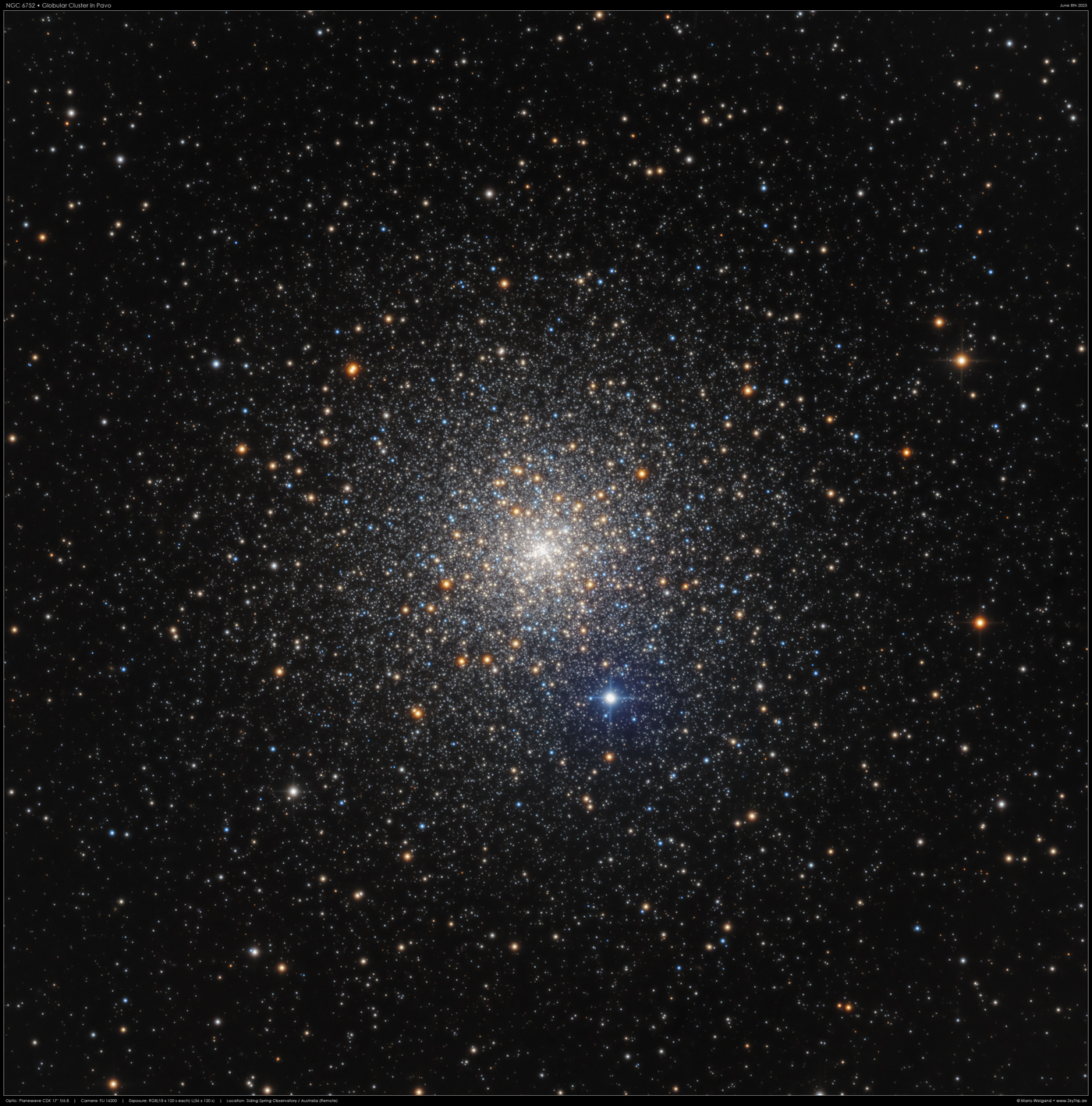 : NGC 6752 ist ein Kugelsternhaufen im Sternbild Pavo (Südhimmel). Er hat eine scheinbare Helligkeit von 5,3 mag und einen Winkeldurchmesser von 29'. Damit ist er nach 47 Tucanae und Omega Centauri der hellste Kugelsternhaufen.
