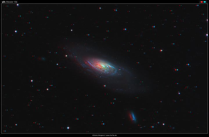 Sie ist von uns über 20 Mio. Lichtjahre entfernt. In M 106 können zahlreiche Staubstrukturen beobachtet werden, die teilweise spiralförmig bis ins Zentrum reichen.