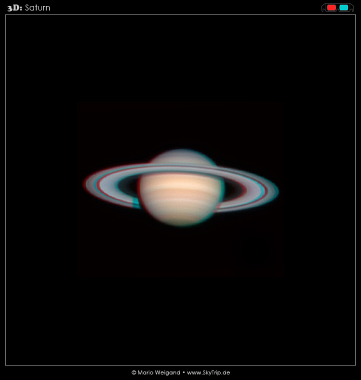 Kommentar: Der Ringplanet Saturn liefert immer einen tollen Anblick. Diese 3D Ansicht besteht aus zwei Aufnahmen, die ich 2007 mit einem Celestron C11 gewonnen habe.