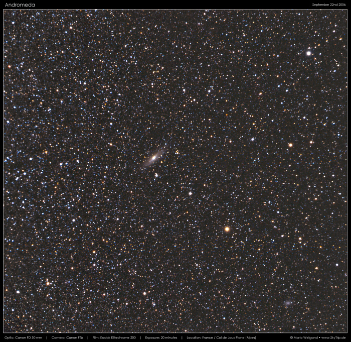 Kommentar: Das Sternbild Andromeda war bereits im Altertum bekannt. Sein Name ist zwar geläufig, das Sternbild selbst hingegen ist weniger auffällig. Der hellste Stern gehört gerade mal zur 2. Größenklasse. Das bekannteste Objekt ist die Andromeda-Galaxie Messier 31, vermutlich das größte Mitglied der lokalen Gruppe; größer als die Milchstraße. Mit 2,2 Millionen Lichtjahre Entfernung ist sie das am weitesten entfernte Objekt, das man noch mit bloßem Auge sehen kann.