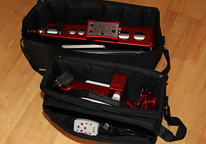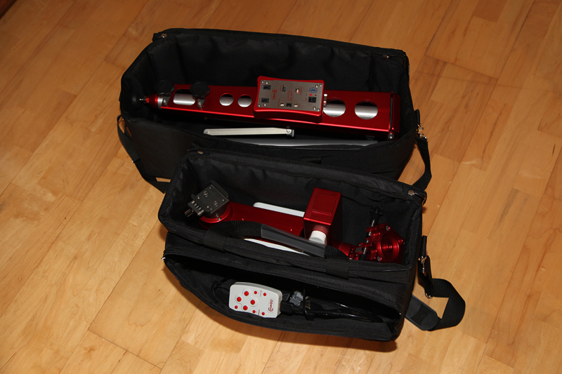 Die Montierung und das Stativ werden je mit einer gepolsterten Weichtasche ausgeliefert in denen alle Teile Platz finden.
