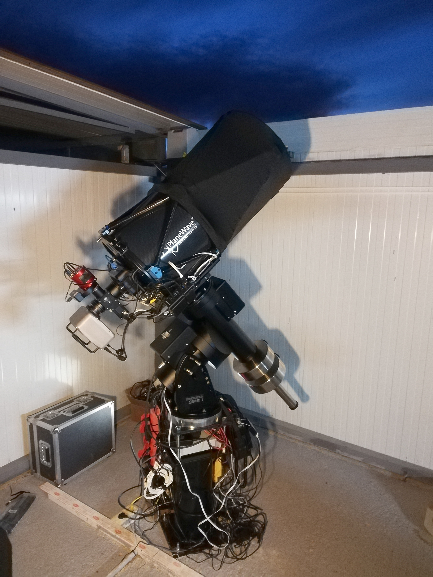 Das Planewave CDK 14 ist ein fotografisch korrigiertes Dall-Kirkham-Cassegrain Spiegelteleskop. Es ist derzeit als Remote-Teleskop in Nordwestspanien stationiert, wo es wesentlich mehr gutes Wetter gibt. Außerdem zeichnet sich aus der bisherigen Praxiserfahrung ab, dass das durchschnittliche Seeing dort ebenfalls deutlich besser als in Deutschland ist. Ein Sampling von 0,74"/Pixel – was mit der alten STL-11000 (bzw. jetzt Moravian G3-11000) und ihren 9 μm Pixeln erreicht wird – kann dort in vielen Nächten genutzt werden.