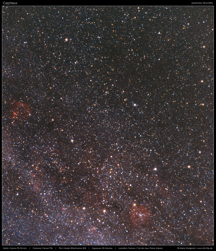 Kommentar: Cepheus (nach dem äthiopischen König Kepheus) liegt am Rande des Milchstraßenbandes und enthält von daher keine auffälligen Sternhaufen oder Nebel, wohl aber eine Vielzahl von Doppelsternen und Veränderlichen. Hierzu gehört zum Beispiel auch das bekannte Objekt δ Cephei, der Prototyp der Cepheiden-Veränderlichen, die als Maßstab bei der Entfernungsbestimmung im Weltall genutzt werden können.
