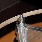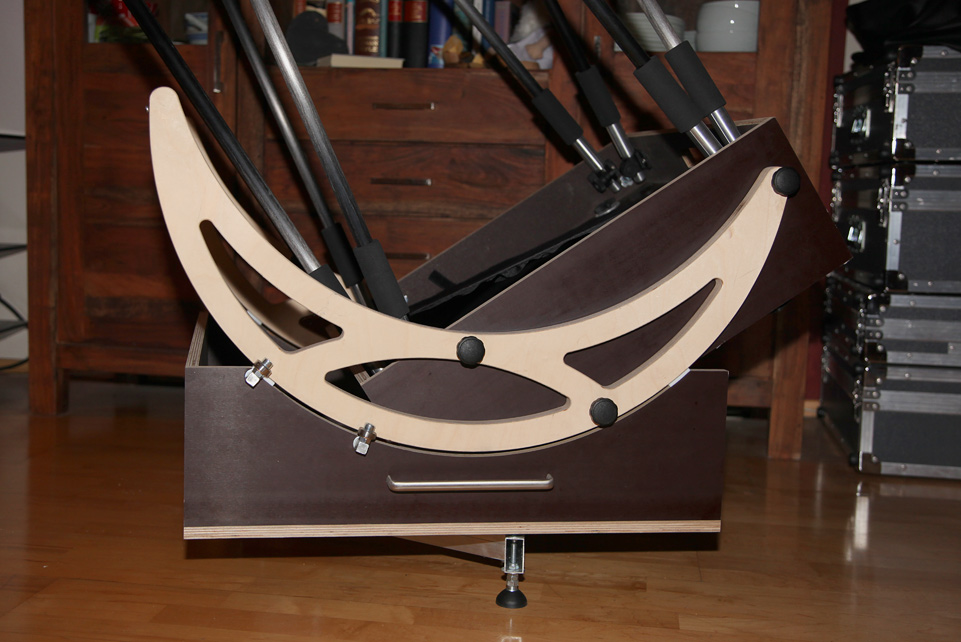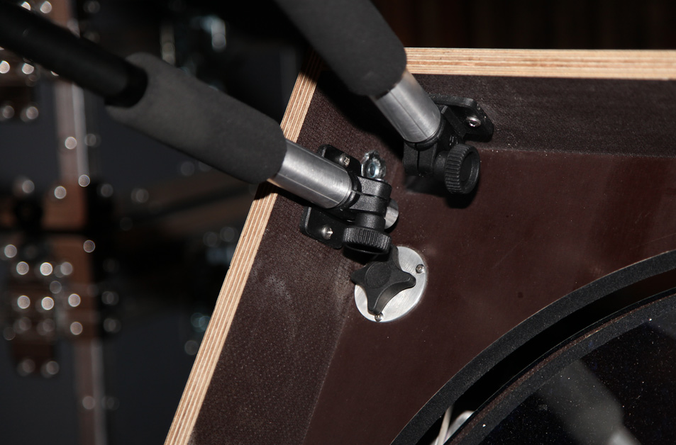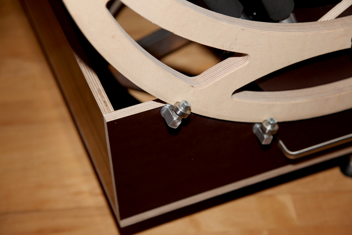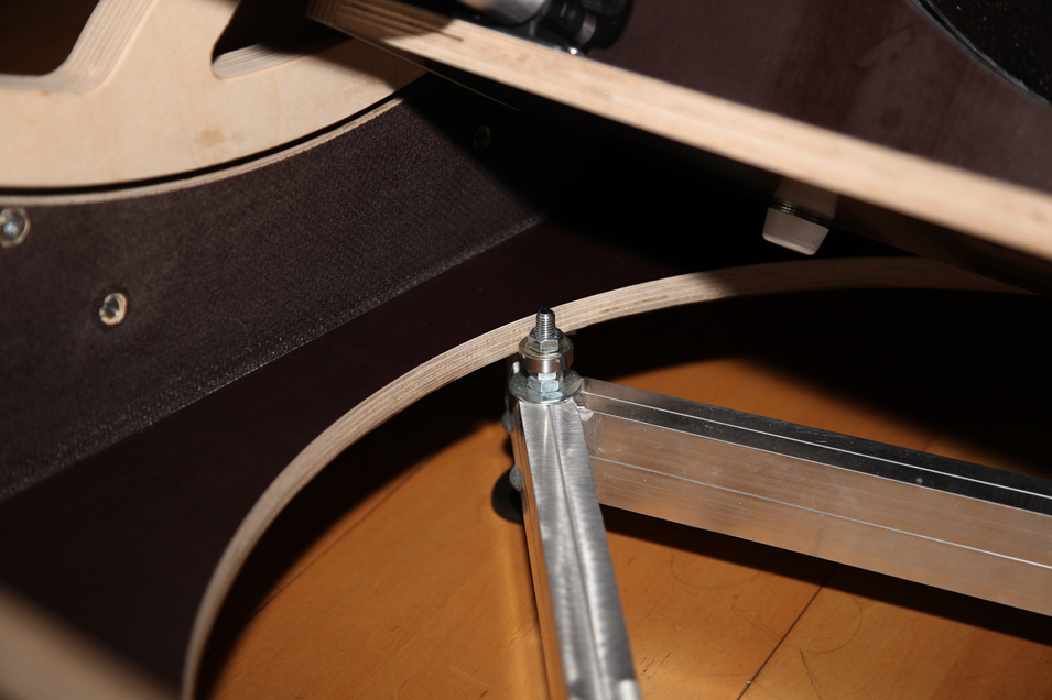 Die Führung läuft über einen 50 cm großen Kreis-Ausschnitt in der Bodenplatte der Rockerbox, dessen Kante über drei Kugellager läuft.