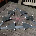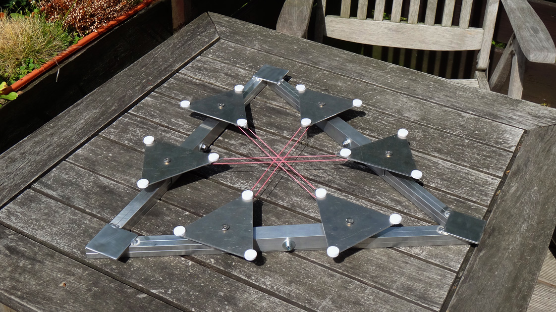 Als Basis die ein geschweißtest gleichseitiges Dreieck aus 20 x 20 mm Alu-Vierkantprofilen. Auf der Mitte jeder Seite wurde ein Art Wippe