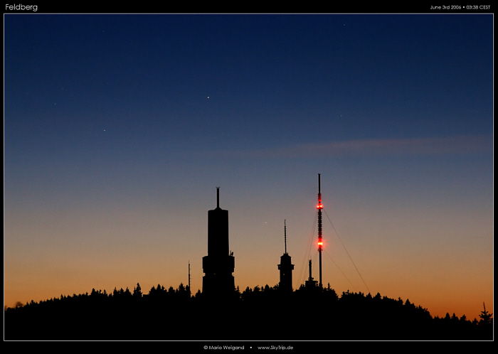 Kommentar: Hier eine Stimmungsaufnahme, die ich am 3. Juni am Ende einer erfolgreichen Beobachtungsnacht gemacht habe. Man sieht die dunklen Silhouetten der Feldbergtürme auf dem großen Feldberg im Taunus. Am Dämmerungshimmel kommen noch ein paar wenige Sterne durch.