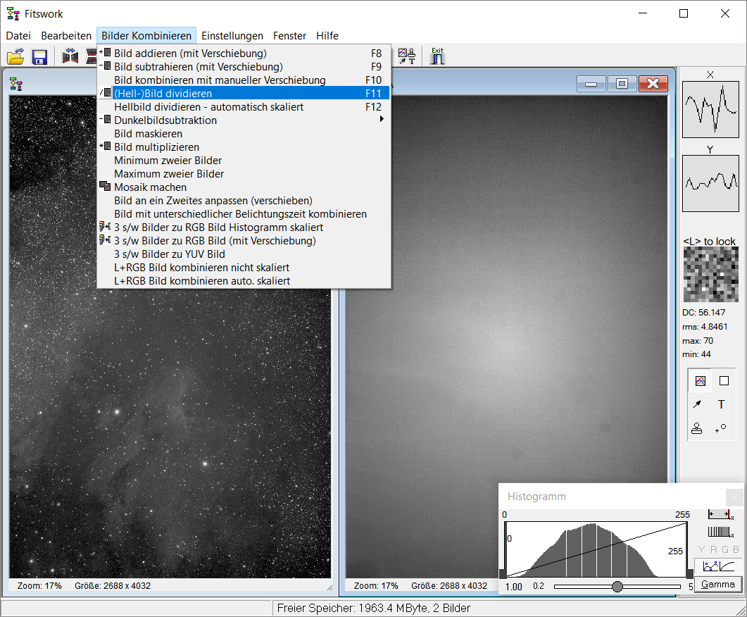 Hat man Rohbild und Flatfield geladen, findet sich die Funktion "Hellbild dividieren" unter dem Menüpunkt "Bilder kombinieren"