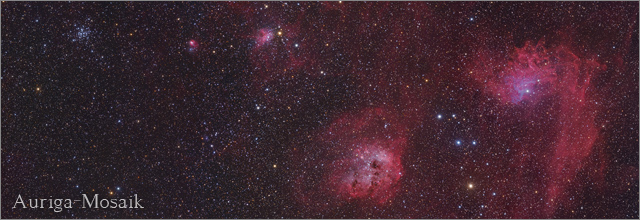 Das Sternbild Fuhrmann bietet einige interessante Nebel und Sternhaufen, wie zum Beispiel IC 410 (Kaulquappennebel). Es ist ein 12000 Lichtjahre entfernter Emissionsnebel mit vielen Staubwolken und dem eingebetteten Sternhaufen NGC 1893.