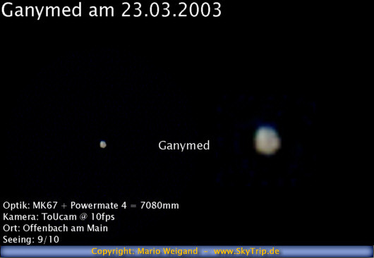 : Jupitermond Ganymed am 23.03.2003 bei sehr gutem Seeing. Es sind sogar grobe Oberflächendetails sichtbar. Verwendet habe ich für diese Aufnahme meine 6" Maksutov-Cassegrain und eine Powermate 4.
