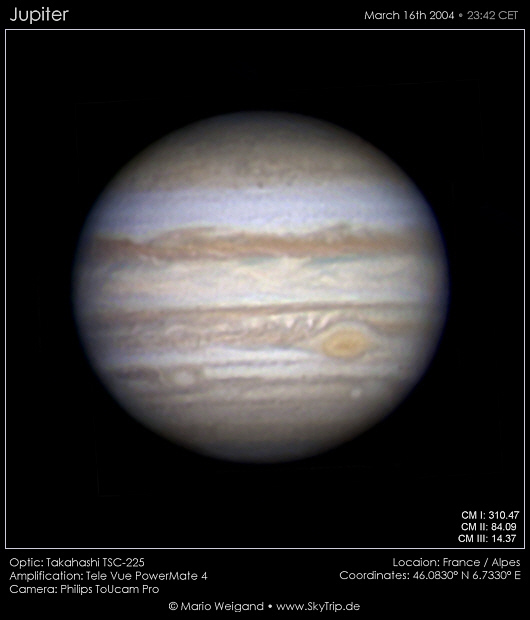 : Am 16, März war in den französischen Alpen (endlich) ziemlich gutes Seeing, sodass ich meine wohl bisher beste Jupiteraufnahme machen konnte. Alle weiteren Versuche in dieser Saison waren eher enttäuschend.