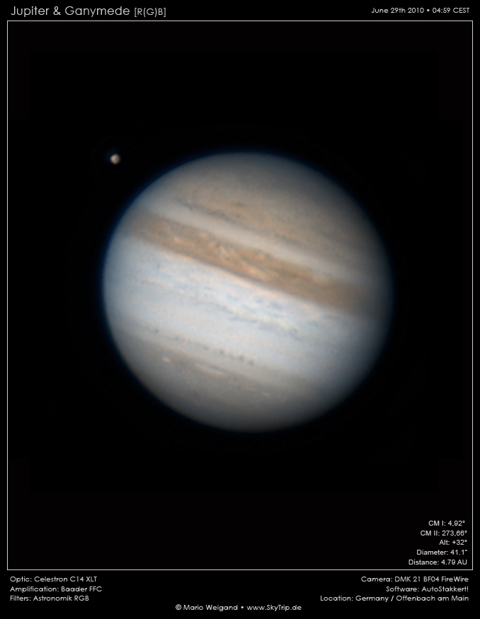 : Das erste Bild der neuen Saison gelang mir am 28. Juni bei 32° Höhe und mittelmäßigem Seeing. Seit der letzten Aufnahme aus 2006 gab es einige Veränderungen in der Jupiter-Atmosphäre. Zuletzt ist das SEB scheinbar völlig verschwunden!