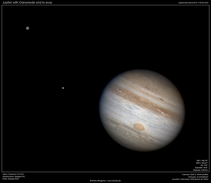 Kommentar: Viele gute Gelegenheiten für Jupiterbeobachtungen gibt es im Rhein-Main-Gebiet derzeit nicht. Selbst in den wenigen klaren Nächten ist das Seeing meist unbrauchbar. Ein wenig Glück hatte ich am 22.09. Das Seeing war so bei 7/10 und es gab ein schönes Stelldichein mit GRF, Io und Ganymed.