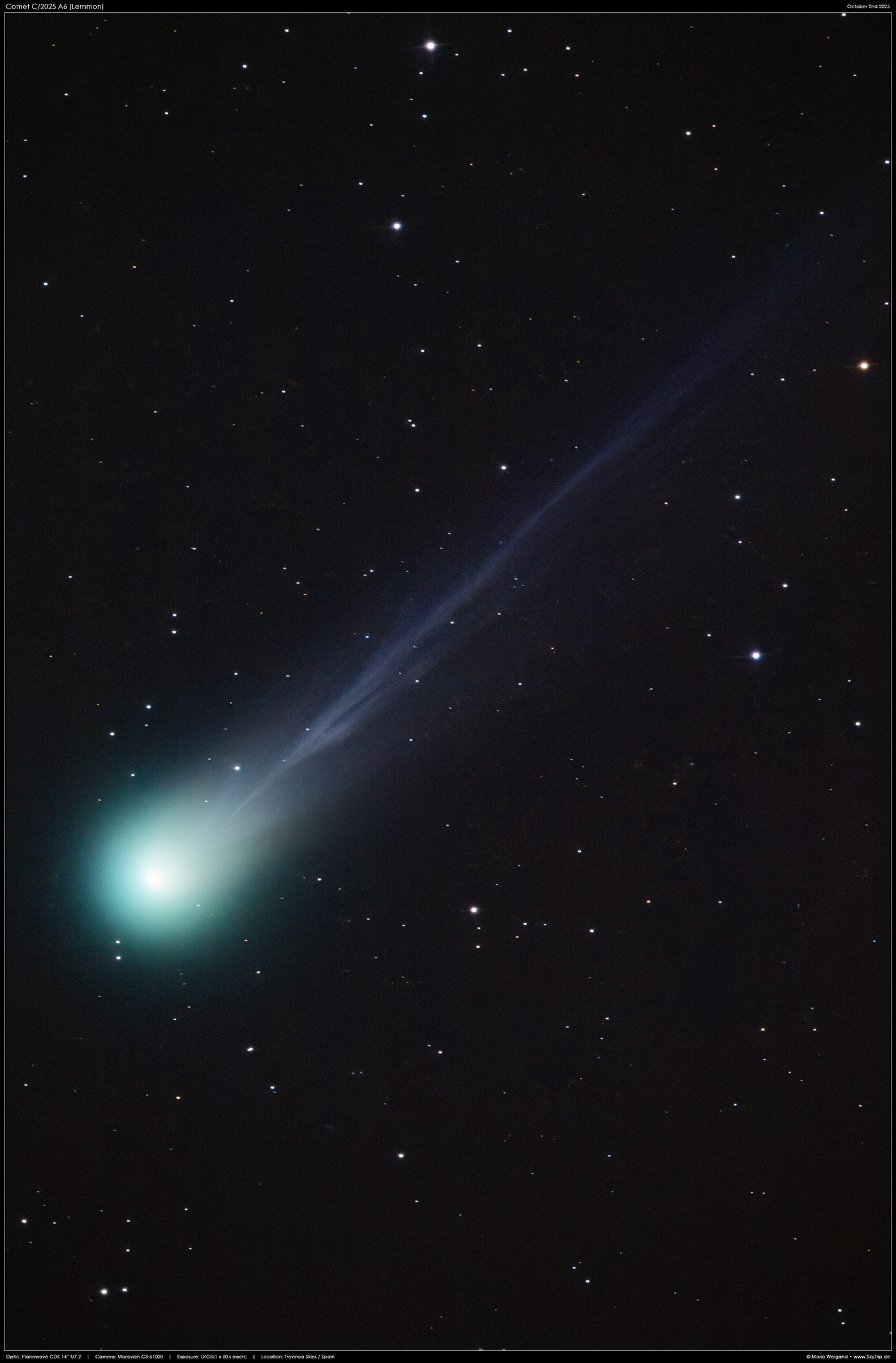 : Komet C/2025 A6 (Lemmon) wird immer heller. Hier ist eine neue Nahaufnahme des Kometen C/2025 A6 (Lemmon) vom 2. Oktober 2025, die wieder viele interessante Strukturen im Schweif zeigt.