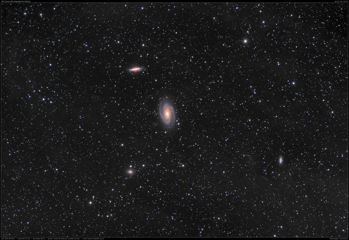 Messier 81 ist eine der auffälligsten Galaxien am Himmel. Übertroffen wird sie nur von der Andromeda-Galaxie und der Triangulum-Galaxie. Sie wird auch genannt, womit ihr Entdecker Johann Elert Bode geehrt wird. Auch die nur 38' entfernt stehende M82 wurde von ihm entdeckt (Dezember 1774 in Berlin). Das Paar ist bereits mit einem Feldstecher ein tolles Beobachtungobjekt.