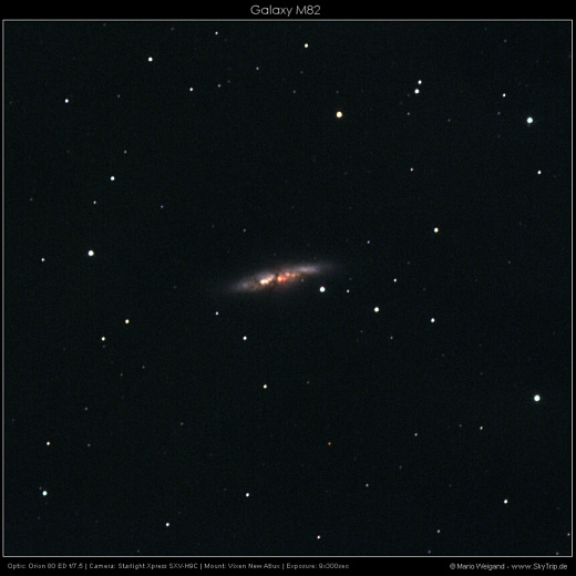 : M82 ist das zweit größte Mitglied der M81-Gruppe, einer Galaxiengruppe im Sternbild Großer Bär (Ursa Major). Es ist eine irreguläre Galaxie mit auffälligen Staubbändern.