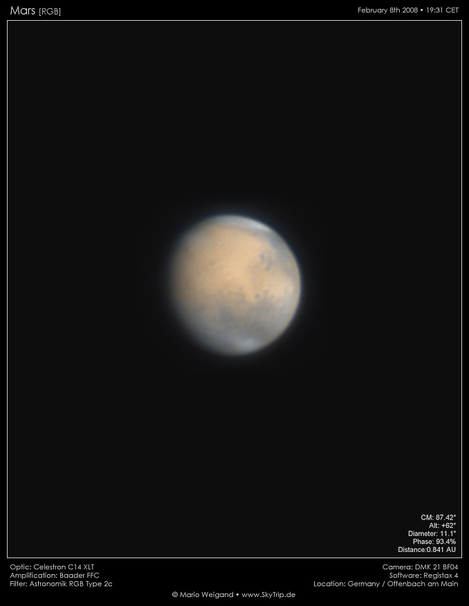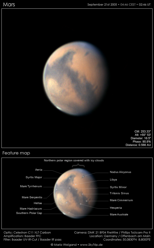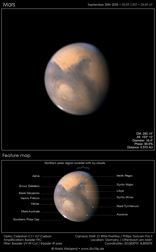Schnell fällt auf, dass Mars scheinbar zweigeteilt ist: die Südhemisphäre ist weitgehend dunkel, die Nordhemisphäre fast nur hell Beige.