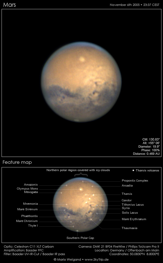 Außerdem fallen die Vulkane aufgrund ihrer Schatten nahe des Terminators auf. Ist gerade Sonnenauf- oder untergang über Tharsis, lohnt es sich nach dunklen Flecken passend zur charakteristischen Anordnung der Tharsis-Vulkane Ausschau zu halten. Weiter oben hatte ich erwähnt, dass Mars praktisch nur Albedodetails Preis gibt, dies hier ist quasi die einzige mir bekannte Ausnahme bei der die Topografie des Planeten sichtbar wird.