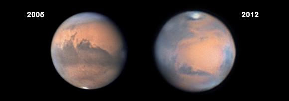 Die dunklen Gebiete scheinen mit der Zeit ihre Farbe und Form etwas zu ändern. Dies liegt am Wettersystem, genauer an Winden, die für eine Umverteilung von Staub auf der Oberfläche sorgen. Solche Veränderungen werden über Zeiträume von Wochen sichtbar. Hier ein Beispiel mit der Region südlich von Sinus Sabaeus, wo sich die Helligkeit von der Opposition 2007 bis zur Opposition 2009/10 deutlich verändert hat.
