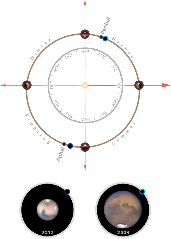 Doch leider liegen die Bahnen von Mars und Erde derart zueinander, dass die günstigen Oppositionen bzgl. des Abstand immer aud die Sommermonate fallen,